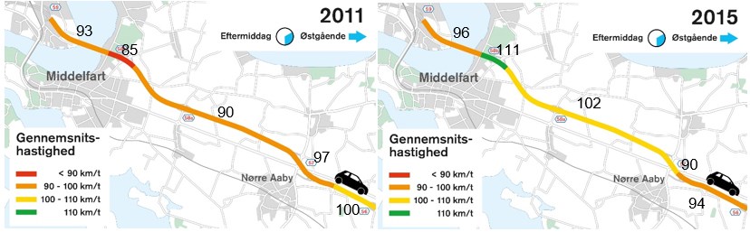 På strækningen er hastigheden i gennemsnit steget med cirka 12 km/t i østgående retning i eftermiddagsmyldretiden. Kortene nedenfor viser de målte hastigheder før og efter det tredje spor.