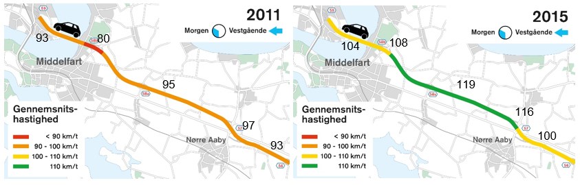 I vestgående retning er hastigheden også steget. Her med 11 – 36 km/t i morgenmyldretiden. Desuden er hastigheden over Lillebæltsbroen steget, fordi trafikanterne ikke holder i kø ved Nr. Aaby.