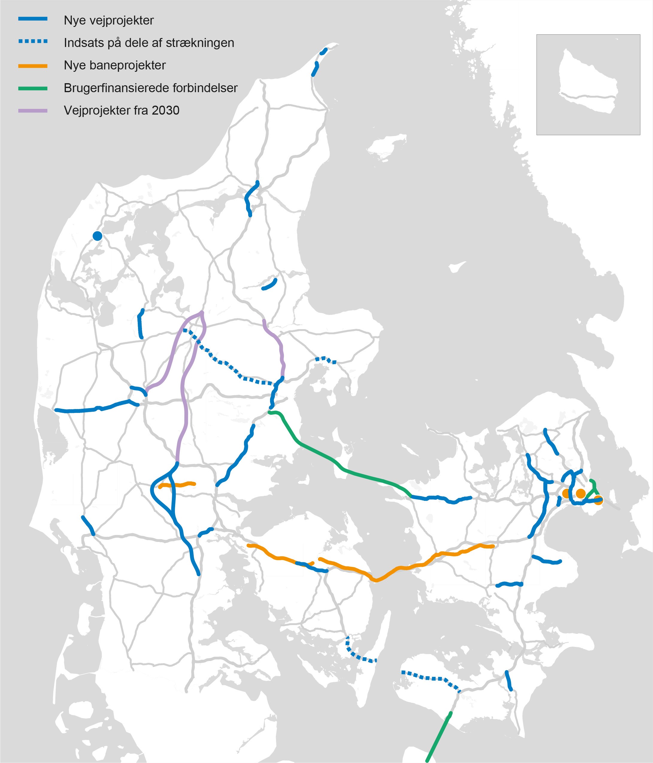 - Med planen får vi 450 kilometer mere vej - nye veje eller udbygninger af eksisterende veje. Det skal være med til at binde Danmark bedre sammen. Vi har prioriteret nye investeringer i alle dele af landet, så det bliver lettere at være dansker, når man skal transportere sig hurtigere til og fra arbejde og besøge familie og venner rundt omkring i Danmark. Desuden har vi sikret en god balance mellem bedre kollektiv trafik og flere veje, så det bliver lettere og hurtigere at komme frem både med tog, i bil og på cykel, siger finansminister Kristian Jensen.