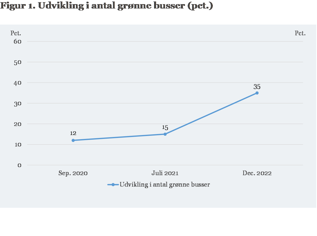 15 pct. af den kollektive bustrafik er omstillet til grøn trafik pr. juli 2021, men godt 1/3 af bustrafikken ventes omstillet ultimo 2022, hvilket vidner om, at udviklingen går stærkt, og at det derfor er attraktivt for kommunerne at indkøbe grønne busser nu.
