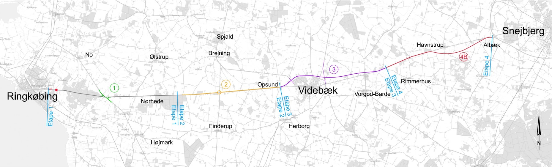 Projektet, der har en ramme på 992 millioner kroner, er inddelt i fire etaper, hvoraf størstedelen af de tre etaper ombygges til 2+1-vej, mens den vestligste etape, mellem Nordre Ringvej/Søndre Ringvej ved Ringkøbing til Attenagrevej øst for Nørhede, ikke udbygges til 2+1-vej.