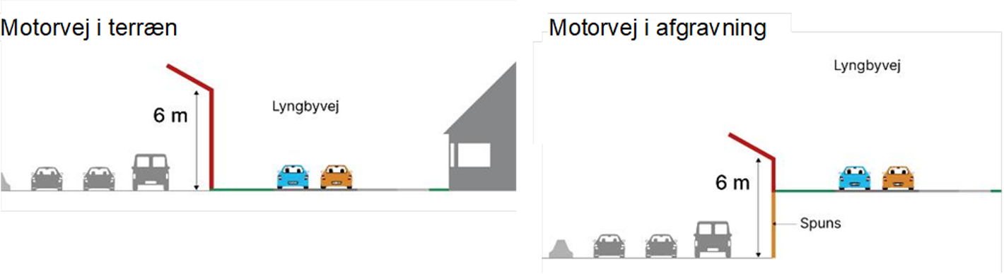 Visualisering af hvordan en støjskærm, af den type der skal opføres langs en del af Helsingørmotorvejen i Gentofte, kan tage sig ud. Skærmene er op til seks meter høje i forhold til vejbanen og dertil kommer et 2 meter højt udhæng, som skråner 3 meter ind over vejen. Den konkrete udformning i projektet vil få et andet udtryk end vist på billedet.